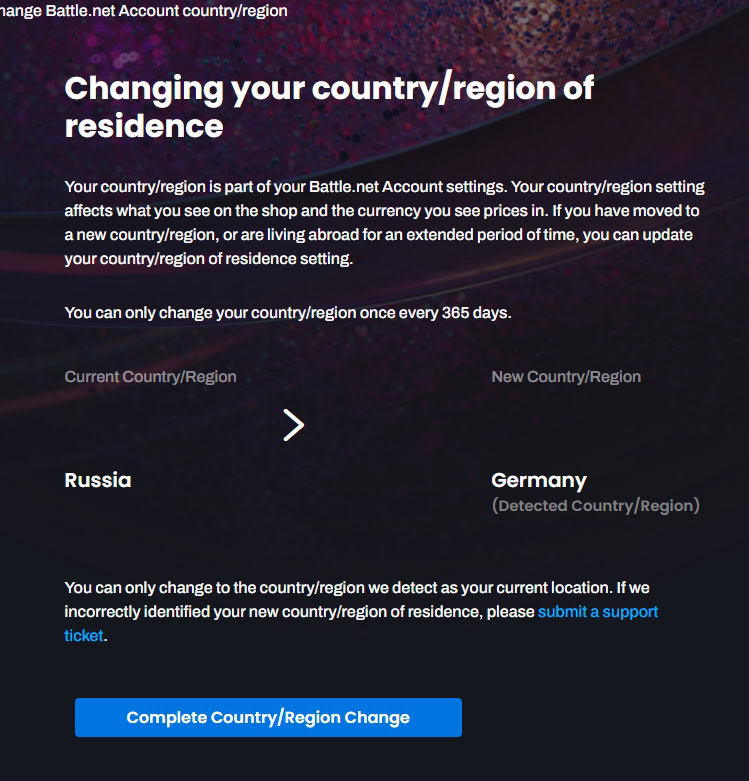 Давайте начистоту. Сейчас в системе Blizzard есть незадокументированная возможность обойти блок и сменить регион с РФ или РБ на европейский. Мы не знаем, фича это или временный баг. Никаких официальных блюпостов на этот счёт нет.
